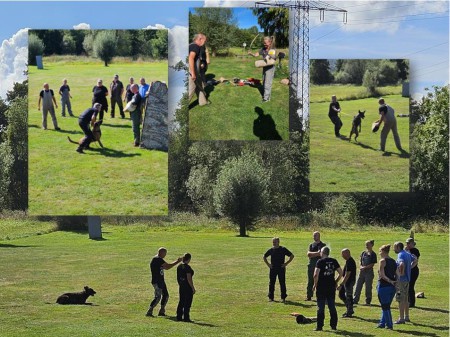 Im ersten Schritt wurden die Bewegungen eines Helfers, die Position des Ärmels, das Schlagen mit den Softstock beim Bedrängen und das Annehmen der Hunde bei der kurzen und langen Flucht, trocken geübt.