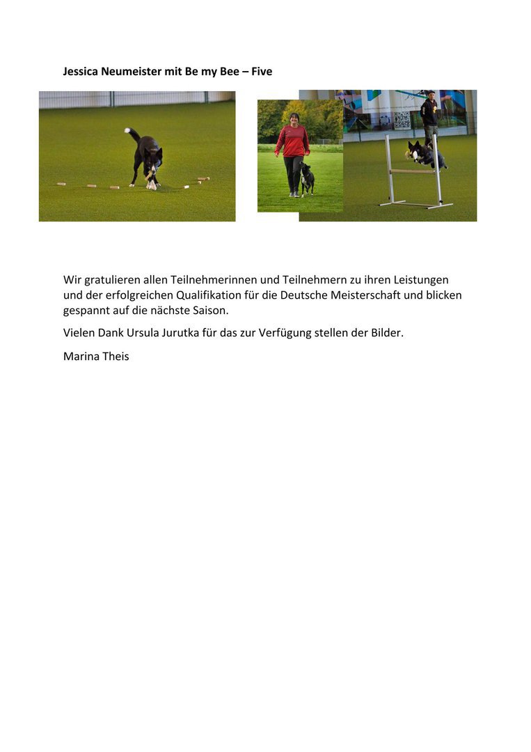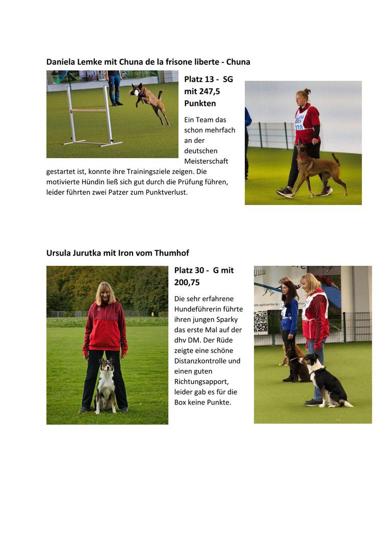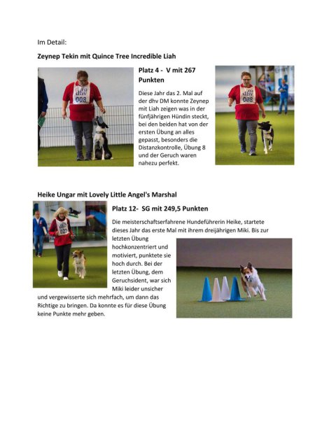 Jessica Neumeister und Smartie Ebenfalls ein neues Team auf der DM-Bühne mit einer ebenfalls sehenswerten Vorführung. Im ersten Ring zeigte sich der junge Rüde noch etwas beeindruckt und ließ daher bei Freifolge und Positionen ein paar Punkte liegen. In zweiten Ring präsentierte sich das Team deutlich sicherer und schaffte es mit 231 Punkten auf Rang 22.