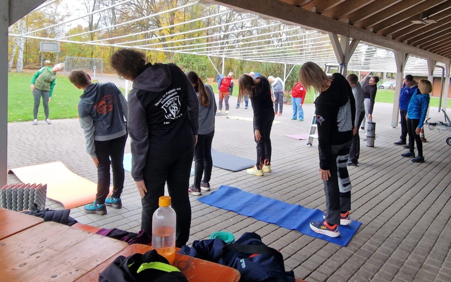 Natürlich durfte auch die körperliche Ertüchtigung der Teilnehmer an beiden Tagen nicht fehlen. Nach einem kleinen Muskel-Workout am ersten Tag, um zwischen der vielen Theorie den Kopf ein wenig frei zu bekommen, wurden den Teilnehmern am zweiten Tag Möglichkeiten für eine sportartgerechte Aufwärmarbeit mit Laufübungen, Dehnübungen und Sprungübungen gezeigt. Selbstverständlich wurde die Aufwärm-arbeit mit und für den Hund dabei nicht vergessen.